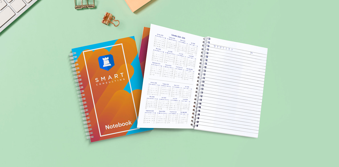 - Personalise front cover, inside front cover and inside back cover with logo, photo, or quote.