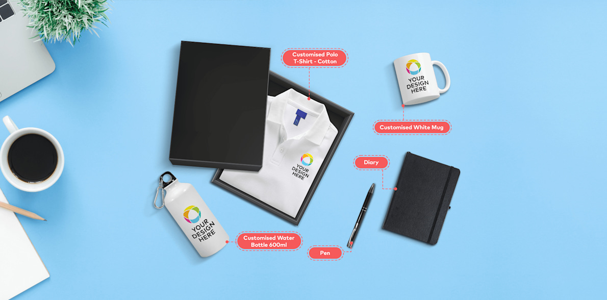 - Note: The uploaded design/logo will be printed on Polo T-Shirt, Water Bottle and Coffee Mug. There will be no customisation on Diary and Pen.